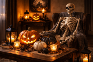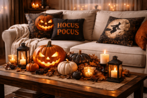 Begin by adjusting lighting. Warm string lights, table lamps, and LED candles instantly create a soft glow. Add Halloween-themed pillows with pumpkin, spider web, or subtle gothic patterns. Textured throws in autumn shades like burnt orange, charcoal, or deep brown enhance the cozy atmosphere.
