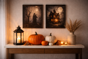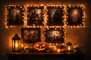 Wall decor is often overlooked, but it plays a powerful role in transforming a home for Halloween. A themed wall gallery adds vertical interest and gives your decor a curated, intentional feel.