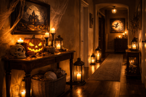 Hallways and entryways are ideal for dramatic Halloween decor because they naturally guide movement. A candlelit hallway creates suspense using lighting rather than heavy decoration.