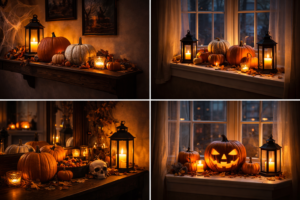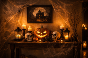 Place LED candles inside lanterns along the floor or on wall-mounted shelves. Soft shadows create an eerie atmosphere without overwhelming the space. Add Halloween mirrors, silhouettes, or minimal wall art to enhance the mood.