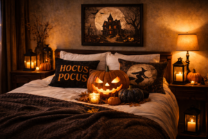 Halloween decor doesn’t need to stop at shared spaces. A few subtle accents can transform a bedroom into a seasonal retreat.