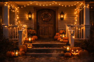 If you prefer a softer Halloween look, combining string lights with seasonal decor is the perfect solution. Warm white or orange lights wrapped around columns, railings, and door frames create a cozy glow that feels festive rather than frightening.