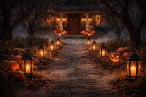 Place lanterns along the walkway at even intervals and use battery-operated candles or warm LED lights. For added Halloween flair, decorate the lantern bases with fake cobwebs, small skulls, or mini pumpkins. The soft glow creates an eerie yet elegant effect after sunset.