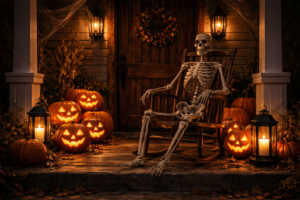 Dress the skeleton in old clothes, a witch hat, or a tattered cloak. Surround the seating area with pumpkins, lanterns, and cobwebs. Adding dim string lights overhead enhances the haunted feel while still keeping the space inviting.