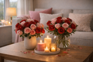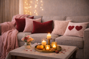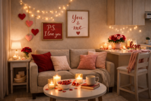Focus on soft textures, warm lighting, and subtle Valentine accents rather than overpowering reds everywhere. Throw pillows in blush, cream, or deep red shades paired with cozy blankets create warmth. Add candles on coffee tables, shelves, or trays to bring intimacy into the space. Heart-shaped accents, floral arrangements, and gentle fairy lights elevate the mood without looking overdone.