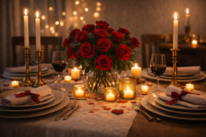Use a soft table runner, layered plates, cloth napkins, and delicate centerpieces. Candles—taper or votive—are essential. Fresh or faux roses, eucalyptus, or baby’s breath work beautifully. Choose neutral tableware and let Valentine colors shine through flowers and linens.