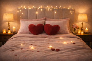 Swap out regular bedding for romantic textures like velvet or cotton with subtle patterns. Add heart-themed pillows, rose petals, and fairy lights around the headboard. Candles or bedside lamps with warm bulbs complete the look.