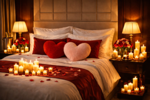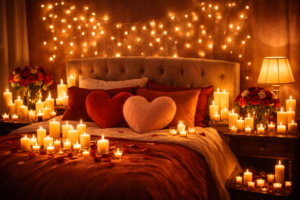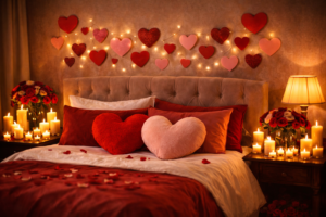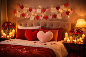 It features traditional Valentine colors like red, blush pink, and white. Soft bedding, heart-shaped pillows, candles, and fresh roses are essential elements. Lighting should always be warm—fairy lights, candles, or soft yellow lamps create intimacy. Curtains and fabrics should be light and flowing to add softness to the room.